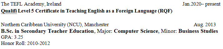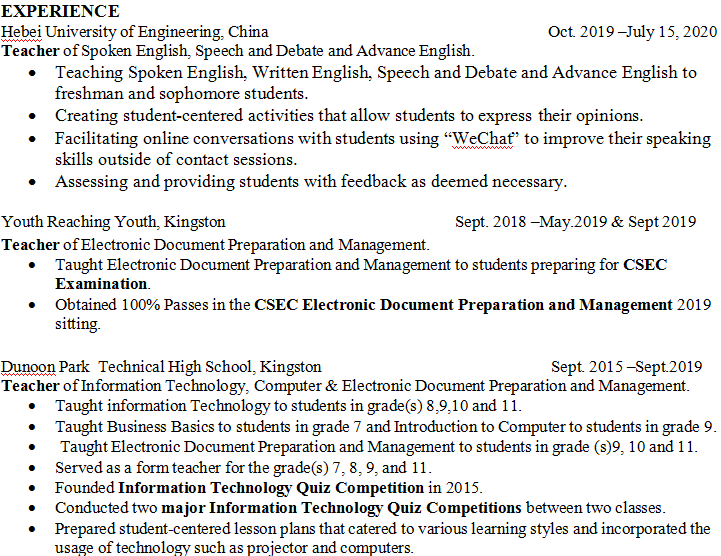 中國河北工程大學(xué)2019年10月– 2020年7月15日 口語,演講,辯論和高級英語老師。 金斯敦,2018年9月– 2019年5月&2019年9月 電子文件準備和管理老師。 2015年9月– 2019年9月,金斯頓Dunoon Park技術(shù)高中 信息技術(shù),計算機和電子文檔準備與管理老師。 教育 愛爾蘭TEFL學(xué)院,2020年1月至今 合格的英語外語教學(xué)(RQF)5級證書 北加勒比大學(xué)(NCU),曼徹斯特,2013年8月 理學(xué)學(xué)士 中學(xué)教師教育專業(yè),計算機科學(xué),輔修商業(yè)研究 |