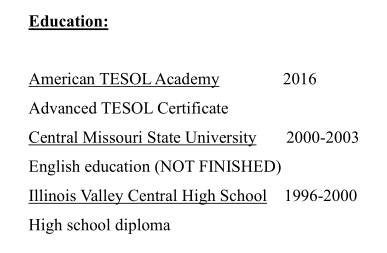 教育: 美國TESOL學(xué)院2016 先進(jìn)的TESOL證書 中央密蘇里州立大學(xué)2000-2003 英語教育(未完成) 伊利諾伊谷中央高中1996-2000 高中畢業(yè)證 |