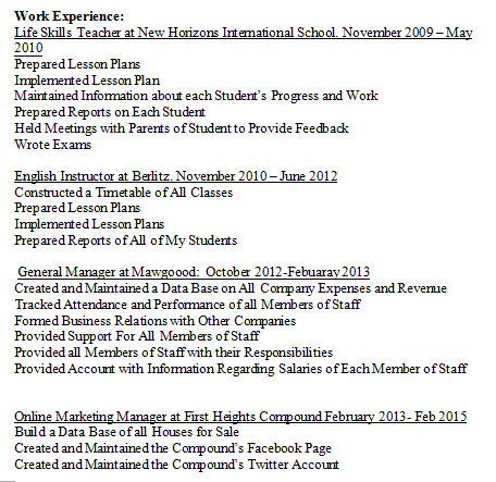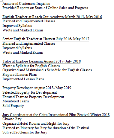 教育背景: 2003-2005美國國際學校在開羅納斯爾市,埃及國際學士學位:總成績:29分 美國高中文憑:A級和B級 2006- 2009南安普頓大學:哲學和社會學學士 2009年夏季TESOL國際1個月120學時6節(jié)課教學經(jīng)驗TESOL課程。語法、發(fā)音、一般英語、聽說和初級課程 工作經(jīng)驗: 2006- 2009南安普頓大學:哲學和社會學學士 2009年夏季TESOL國際1個月120學時6節(jié)課教學經(jīng)驗TESOL課程。語法、發(fā)音、一般英語、聽說和初級課程。 伯利茨大學的英語教師。2010年11月- 2012年6月 Mawgoood總經(jīng)理:2012年10月- 2013年2月 2013年2月- 2015年2月,在第一高地的在線營銷經(jīng)理 Reach Out Academy英語教師2015.3 - 2016.5 探究式學習導師2017年8月- 2018年7月 房地產(chǎn)開發(fā)商2018年8月- 2019年5月 2018年冬季開羅國際電影節(jié)評審團協(xié)調(diào)員選擇陪審團為陪審團安排酒店房間和航班為評審團計了節(jié)日期間的行程為陪審團解決了問題 牛津豪斯學院英語教師2019年6月- 2019年9 民興實驗中學英語教師2019年9月-至今 |