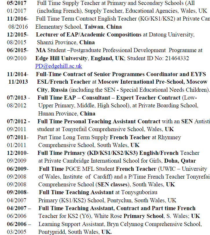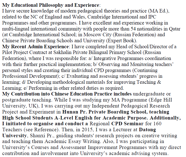 我有現(xiàn)代教育理論和實踐(碩士學位)的可靠知識,與英格蘭和威爾士的NC,劍橋國際和IPC課程和其他課程相關(guān)。我在卡塔爾(Cambridge international School)擁有超過54個國家的多語種國際社區(qū)工作的優(yōu)秀經(jīng)驗(在劍橋國際學校(Cambridge international School)學習;在莫斯科市(俄羅斯聯(lián)邦)和中國的私立寄宿學校和大學(專家書)。 |