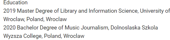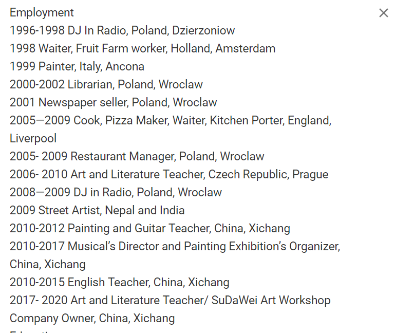 工作經(jīng)歷: 2006- 2010捷克共和國藝術(shù)與文學(xué)老師,布拉格 2008年– 2009年,波蘭廣播電臺,弗羅茨瓦夫的DJ 2009 街頭藝術(shù)家,尼泊爾和印度 2010-2012 繪畫吉他老師,中國西昌 2010-2017 音樂總監(jiān)和繪畫展的組織者,中國西昌 2010-2015 中國西昌英語教師 2017- 2020 藝術(shù)與文學(xué)老師/蘇大為藝術(shù)工作室公司老板,中國,西昌 教育 2019波蘭弗羅茨瓦夫大學(xué)圖書館和信息科學(xué)碩士學(xué)位 2020年,波蘭弗羅茨瓦夫Dolnoslaska Szkola Wyzsza College音樂新聞學(xué)學(xué)士學(xué)位 |