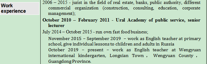 000–2005]秋明國家世界經(jīng)濟(jì)、管理和法律研究所。 高等教育文憑 資格:法學(xué)家 擴(kuò)展教育:專業(yè)交流領(lǐng)域的翻譯(英語) [2005-2009]秋明州立大學(xué)。國家和法律研究所。研究生學(xué)習(xí)。 博士。依法 [2011-2012年5月]俄羅斯聯(lián)邦國民經(jīng)濟(jì)企業(yè)經(jīng)理培訓(xùn)總統(tǒng)計劃。秋明州立大學(xué)。 專業(yè)化:財務(wù)管理 DAAD證書(德國學(xué)術(shù)交流服務(wù))2007年6月18日至03日 2006-2015年-房地產(chǎn)、銀行、公共機(jī)構(gòu)、不同商業(yè)組織(建筑、咨詢、教育、企業(yè)管理)領(lǐng)域的法學(xué)家; 2010年10月-2011年2月——烏拉爾公共服務(wù)學(xué)院高級講師 2014年7月至2015年10月,經(jīng)營自己的快餐業(yè)務(wù); 2015年11月至2019年9月——在小學(xué)擔(dān)任英語教師,為俄羅斯的兒童和成人提供個性化課程 2019年10月至今,在廣東省翁源縣龍仙鎮(zhèn)翁源國際幼兒園擔(dān)任英語教師。 |