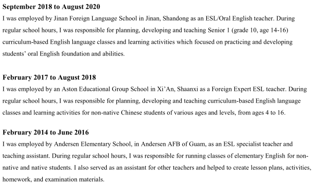 工作經(jīng)驗(yàn): 2018年9月至2020年8月 我受雇于山東濟(jì)南濟(jì)南外國語學(xué)校,擔(dān)任ESL /英語口語老師 2017年2月至2018年8月 我受雇于陜西西安市的阿斯頓教育集團(tuán)學(xué)校,擔(dān)任外語專家ESL講師 2014年2月至2016年6月 我受雇于關(guān)島安徒生空軍基地的安徒生小學(xué),擔(dān)任ESL專業(yè)老師, 教學(xué)助手。 2011-2014阿什福德大學(xué),克林頓,IA 52732 本科,英語語言學(xué)習(xí),人力資源管理 |