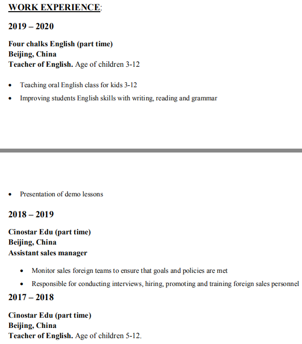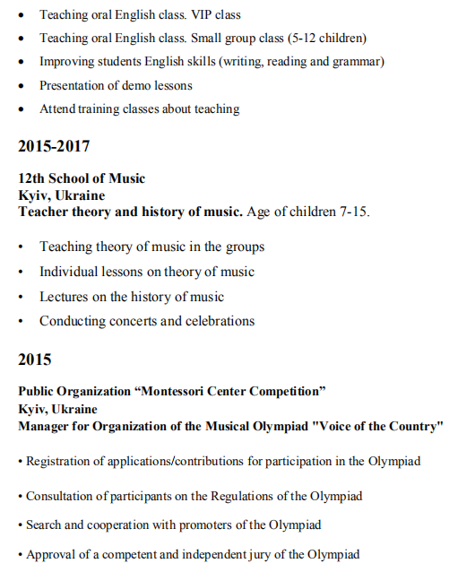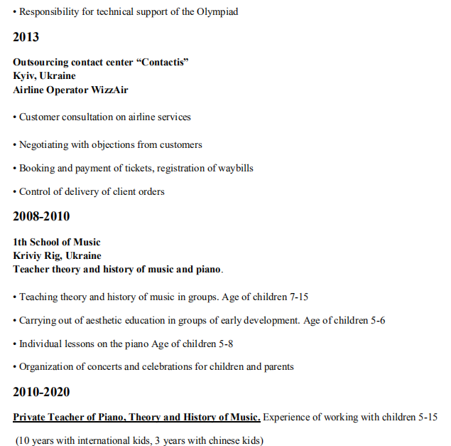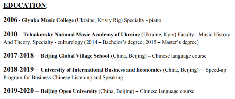 教育背景: 2006年-格連卡音樂學(xué)院(烏克蘭,克里維里格)專業(yè)-鋼琴 2010年-柴可夫斯基國家音樂學(xué)院(烏克蘭,基輔)教師-音樂史和理論。專業(yè)-文化學(xué)(2014 -學(xué)士學(xué)位;2015 -碩士) 2017-2018 -北京地球村學(xué)校(中國,北京)-中文課程 2018-2019 -對(duì)外經(jīng)濟(jì)貿(mào)易大學(xué)(中國,北京)-提速商務(wù)漢語聽說課程 2020 -北京開放大學(xué)(中國,北京)-中文課程 2018-2019:北京 英語老師(兼職) 2015-2017:烏克蘭 音樂學(xué)校 音樂老師 2015:烏克蘭 蒙特梭利中心競賽 |