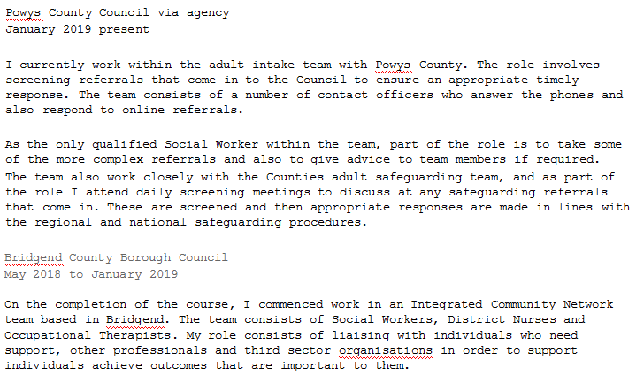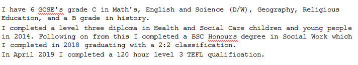 我于2014年完成了健康與社會護理兒童和年輕人三級文憑。此后,我完成了BSC社會工作榮譽學位,并于2018年以2:2的等級畢業(yè)。 在2019年4月,我完成了120小時的3級TEFL資格考試。 |