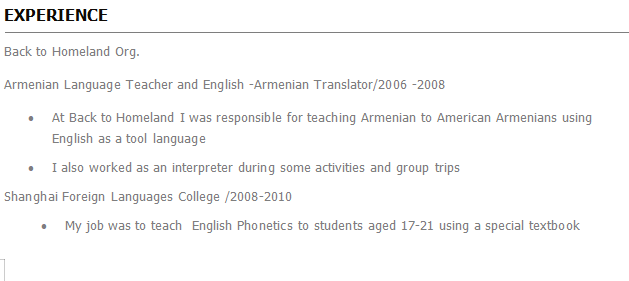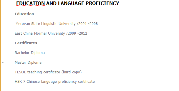 經(jīng)驗(yàn): 亞美尼亞語(yǔ)老師和英語(yǔ)-亞美尼亞語(yǔ)翻譯/ 2006 -2008 彩虹英語(yǔ)/ 2012-2014我在語(yǔ)言中心為3-10歲的孩子講英語(yǔ),使用多媒體,游戲,歌曲,活動(dòng),故事和對(duì)話 小光國(guó)際幼兒園/ 2014-2017 海倫·多倫 英語(yǔ)教師 / 2018-2019 教育經(jīng)歷: 教育 埃里溫國(guó)立語(yǔ)言大學(xué) 碩士 漢語(yǔ)7級(jí), tefl |