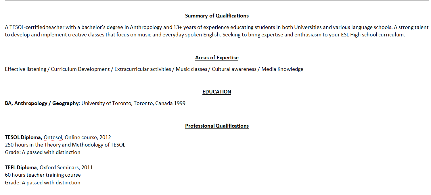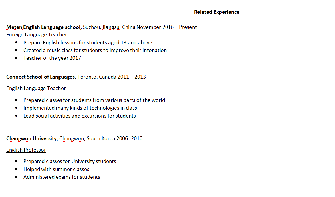 教育 文學學士,人類學/地理學;多倫多大學,加拿大多倫多 TESOL文憑 2016年11月–至今,中國江蘇蘇州蘇州梅滕英語學校 連通語言學院,加拿大多倫多,2011年– 2013年 昌原大學,昌原市,韓國2006- 2010 英文教授 |