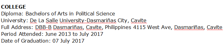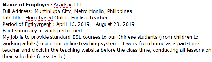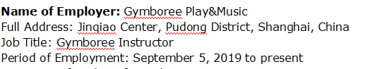 文憑:政治學(xué)文學(xué)士 大學(xué):德拉維爾大學(xué)-達(dá)斯馬里尼亞斯市,甲米地 雇主名稱:Acadsoc Ltd. 詳細(xì)地址:菲律賓馬尼拉大都會(huì)區(qū)蒙廷盧帕市 名稱:家庭在線英語老師 任職期:2019年4月16日– 2019年8月28日 單位名稱:Gymboree Play&Music 詳細(xì)地址:中國上海市浦東區(qū)金橋中心 名稱:老師 任職期:2019年9月5日至今 |
