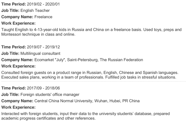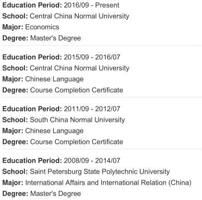 時間段:2017/09-2018/06 名稱:留學(xué)生辦公室主任 公司名稱:華中師范大學(xué),湖北武漢 時間段:2019/02-2020/01 名稱:英語老師 公司名稱:自由職業(yè)者 學(xué)制:2016/09-現(xiàn)在 學(xué)校:華中師范大學(xué) 專業(yè):經(jīng)濟學(xué) 學(xué)位:碩士學(xué)位 |
