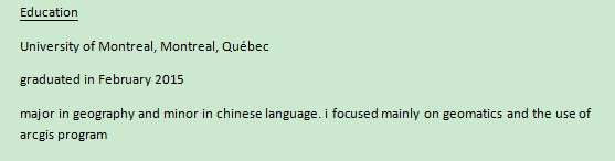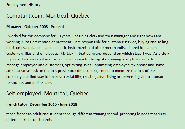魁北克蒙特利爾蒙特利爾蒙特利爾大學(xué) 2015年2月畢業(yè) 主修地理,副修中文。我主要關(guān)注地理信息和arcgis程序的使用 Comptant.com、蒙特利爾、魁北克 經(jīng)理2008年10月至今 我為這家公司工作了10年。我開始是職員,然后是經(jīng)理,現(xiàn)在我在損失預(yù)防部門工作。我負責(zé)客戶服務(wù),購買和銷售電器,游戲,樂器和其他商品。我需要管理客戶文件和員工。我在那家公司的任務(wù)取決于我所處的階段。作為一名職員,我的主要任務(wù)是客戶服務(wù)和電腦維修。作為一名經(jīng)理,我的任務(wù)是管理員工和客戶,優(yōu)化銷售,優(yōu)化員工,修理電話和一些行政工作。在損失預(yù)防部門,我需要最大限度地減少公司的損失,并想方設(shè)法提高可租性,制作廣告或阻止視頻、人力資源和在線銷售。 魁北克省蒙特利爾個體經(jīng)營者 法語導(dǎo)師,2015年12月-2018年6月 通過不同培訓(xùn)學(xué)校向成人和學(xué)生教授法語。準(zhǔn)備適合不同學(xué)生的課程 |
