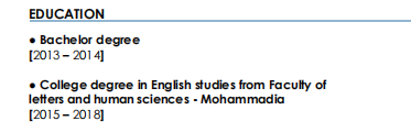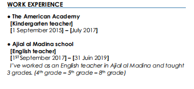 教育 ●學(xué)士學(xué)位 [2013年– 2014年]●來自英國大學(xué)的英語研究專業(yè) 工作經(jīng)驗(yàn) ●美國科學(xué)院 [幼兒園老師] [2015年9月1日] – [2017年7月]● Ajial al Madina學(xué)校 [英語老師] [2017年9月1日] – [2019年6月31日] 我曾在Ajial al Madina擔(dān)任英語老師,并教過 3年級。 (4年級– 5年級– 8年級) |