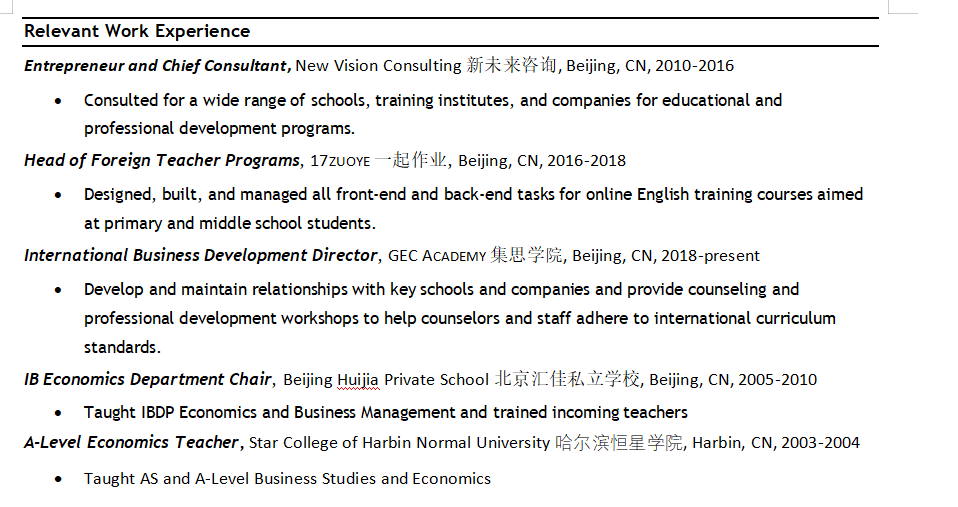 相關(guān)工作經(jīng)歷 一起作業(yè), Beijing, CN, 2016-2018 集思學(xué)院, Beijing, CN, 2018-present 北京匯佳私立學(xué)校, Beijing, CN, 2005-2010 哈爾濱恒星學(xué)院, Harbin, CN, 2003-2004 ?教授AS和A-Level商業(yè)研究與經(jīng)濟(jì)學(xué) 教育 國際教育文學(xué)碩士; 紐約大學(xué)紐約 經(jīng)濟(jì)學(xué)學(xué)士學(xué)位; |