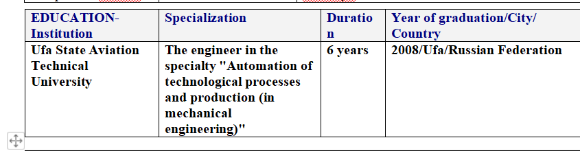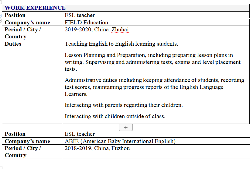 工作經(jīng)驗(yàn) 職位ESL老師 公司名稱FIELD Education 職位ESL老師 公司名稱ABIE(美國國際嬰兒英語) 期間/城市/國家/地區(qū)2018-2019,中國,福 職位ESL老師 公司名稱優(yōu)勝者教育 期間/城市/國家/地區(qū)2017-2018,中國,福州 教育經(jīng)歷: 烏法國立航空技術(shù)大學(xué)“技術(shù)過程和生產(chǎn)自動(dòng)化專業(yè)“ |
