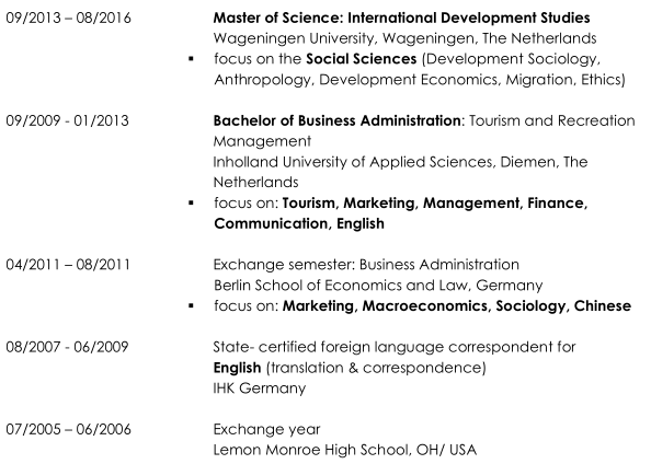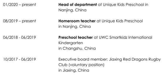 教育和培訓(xùn) 09/2013 – 08/2016理學(xué)碩士:國(guó)際發(fā)展研究 瓦赫寧根大學(xué),荷蘭瓦赫寧根 工作經(jīng)歷 01/2020 –目前,美國(guó)Unique Kids Preschool部門主管 中國(guó)南京 08/2019 –至今,Unique Kids Preschool的班主任 在中國(guó)南京 06/2018-06/2019 UWC Smartkidz International的學(xué)前班老師 幼兒園 在中國(guó)常熟 和南非老公一起求職 |