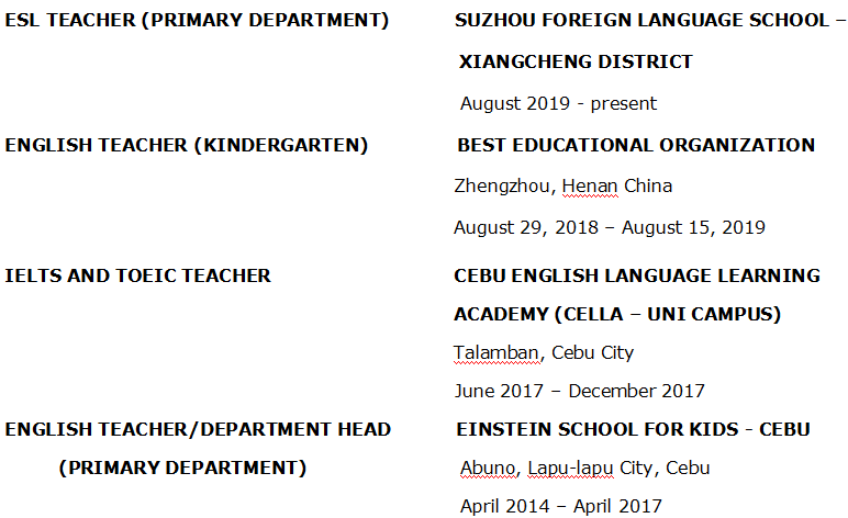學(xué)院 文憑:基礎(chǔ)教育學(xué)士(BEED) 大學(xué):宿霧大學(xué) ESL老師(小學(xué)部)蘇州外國(guó)語(yǔ)學(xué)校– 香城區(qū) 2019年8月至今 英文老師(幼兒園)最佳教育組織 中國(guó)河南鄭州 2018年8月29日– 2019年8月15日 |