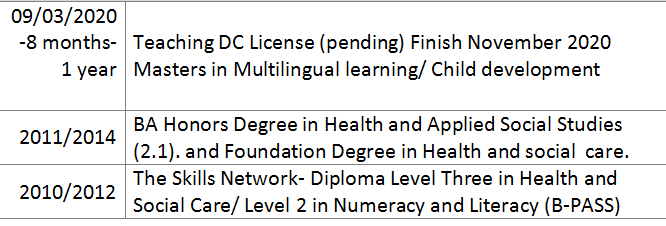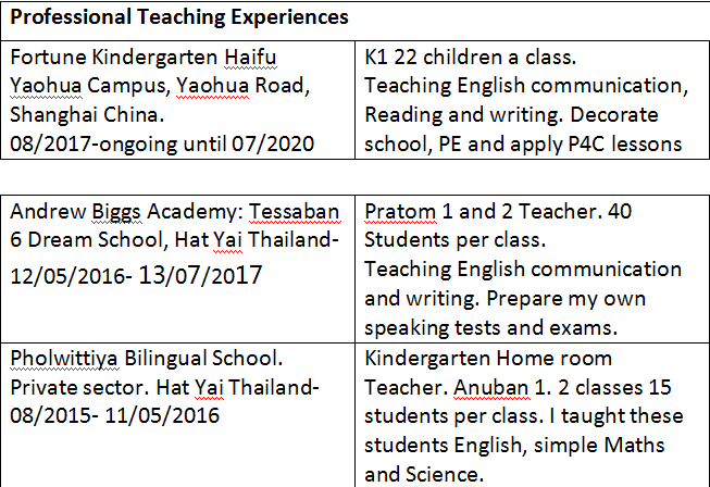 中國上海市耀華路海福財富幼兒園。 08 / 2017-進行至07/2020 安德魯·比格斯學院:泰國合艾Tessaban 6夢想學校-2016年12月5日-2017年7月13日 2011/2014年,衛(wèi)生與應用社會研究學士學位(2.1)。 衛(wèi)生和社會護理基礎學位。 |