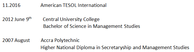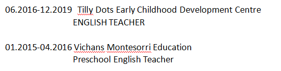 工作 06.2016-12.2019蒂莉點幼兒發(fā)展中心 英語老師 01.2015-04.2016 Vichans Montesorri教育 學齡前英語老師 11.2016美國TESOL國際 2012年6月9日中央大學學院 管理研究理學學士 |