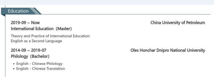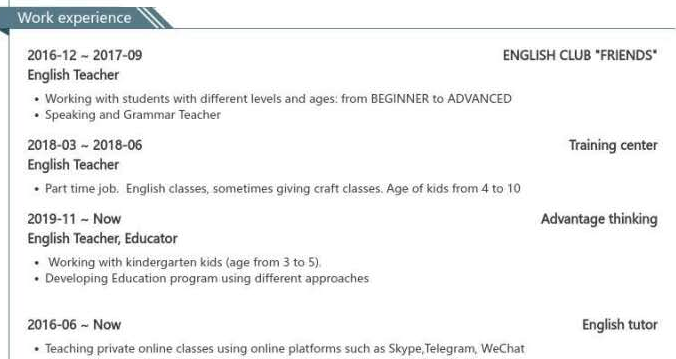 2014.09-2019.07 哲學(xué)專業(yè)畢業(yè)2019.09-現(xiàn)在 國(guó)際教育專業(yè)碩士,英語作為第二語言。 2019-現(xiàn)在,,幼兒園任教,3-5歲的學(xué)生,開發(fā)教學(xué)項(xiàng)目; 2018.03-2018.06,兼職英語老師,會(huì)有手工課,4-10歲的學(xué)生; 2019.12-2017.09,英語老師,教授語法等。 |