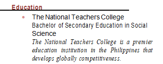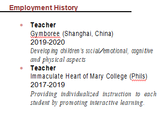 工作經(jīng)歷: 上海金寶貝 圣母瑪利亞學院(Phils)2017-2019完美之心 教育經(jīng)歷: ?國立師范學院 社會科學中學教育學士 |