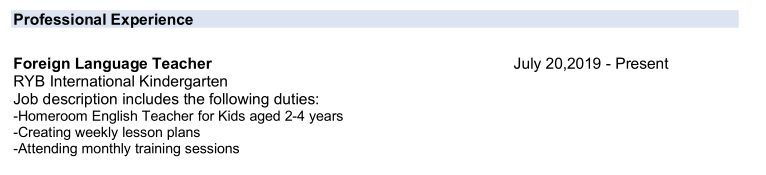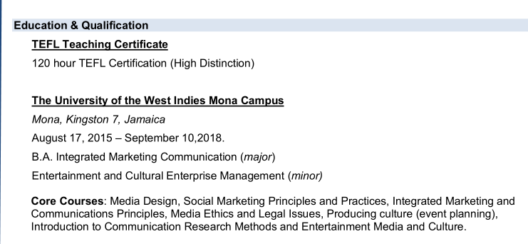 專業(yè)經(jīng)驗 外語老師2019年7月20日至今 RYB國際幼兒園 職位描述包括以下職責(zé): -2-4歲兒童的家庭英語老師 -制定每周的課程計劃 -參加每月一次的培訓(xùn) 學(xué)歷 TEFL教學(xué)證書 120小時TEFL認證(出色) 西印度群島大學(xué)蒙娜校區(qū) B.A. 整合營銷傳播(主要) 娛樂和文化企業(yè)管理(輔修) 核心課程:媒體設(shè)計,社會營銷原理與實踐,整合營銷和 傳播原則,媒體倫理和法律問題,生產(chǎn)文化(活動策劃), 傳播研究方法和娛樂媒體與文化概論。 |