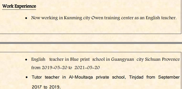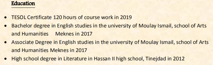 教育背景: TESOL證書 2019 穆萊伊斯梅爾大學(xué)藝術(shù)學(xué)院英語研究學(xué)士學(xué)位(2017) 穆萊伊斯梅爾大學(xué)藝術(shù)學(xué)院英語研究副學(xué)士學(xué)位(2017) 哈桑二世高中文學(xué)專業(yè)的高中學(xué)位 教學(xué)背景: 四川省廣元市藍圖學(xué)校的英語老師2019-05-20到2021-05-20 2017至2019 廷吉達的Al-Moultaqa私立學(xué)校任教 |