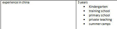 教育背景: TESOL 世界語(yǔ)言學(xué)院(以英語(yǔ)為第二語(yǔ)言) 漢語(yǔ)五級(jí) 教學(xué)經(jīng)驗(yàn): 三年教學(xué)經(jīng)驗(yàn) 在幼兒園 培訓(xùn)學(xué)校 小學(xué) 家教 夏令營(yíng) |
