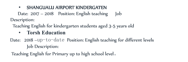 學(xué)院/學(xué)校名稱 青年學(xué)院 幼兒園 日期:2017 – 2018職位:英語教學(xué)工作 描述: 為3-5歲的幼兒園學(xué)生教授英語 ?Torsh教育 日期:2018年至今最新職位:不同級別的英語教學(xué) 職位描述: 小學(xué)至高中英語教學(xué) |
