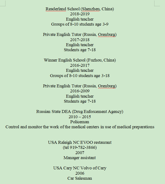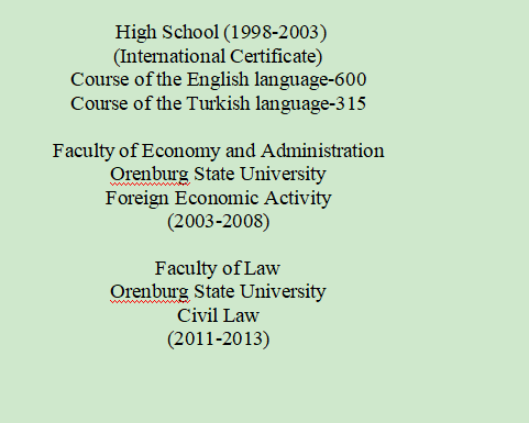 奧倫堡國立大學(xué),法學(xué)碩士,經(jīng)濟(jì)學(xué)學(xué)士,在美國做過經(jīng)理助理和汽車推銷員,在俄羅斯做過警察和英語教師,在中國教學(xué)約3年 |