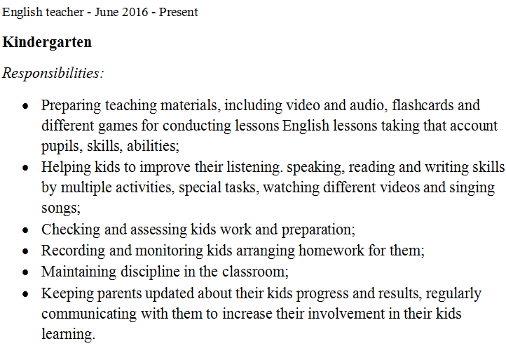專(zhuān)業(yè)經(jīng)驗(yàn) 英語(yǔ)老師-2016年6月-現(xiàn)在 幼兒園 職責(zé): ?準(zhǔn)備教學(xué)材料,包括視頻和音頻,抽認(rèn)卡和各種游戲,以考慮到學(xué)生,技能和能力的英語(yǔ)課; 學(xué)術(shù)資格 烏日哥羅德國(guó)立大學(xué)2010年9月-2016年6月 英語(yǔ)翻譯碩士,英語(yǔ)老師 |