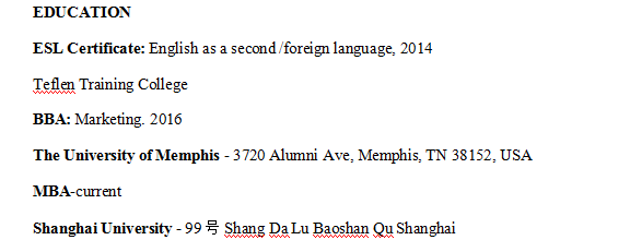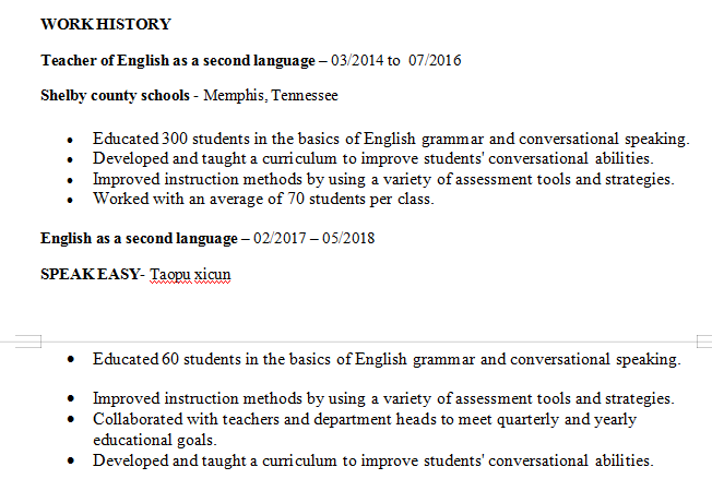 工作經(jīng)歷 英語作為第二語言的老師– 03/2014至07/2016 學(xué)校-田納西州孟菲斯 ?對300名學(xué)生進(jìn)行了英語語法和會話基礎(chǔ)教育。 ?開發(fā)并講授課程,以提高學(xué)生的對話能力。 ?通過使用各種評估工具和策略來改進(jìn)教學(xué)方法。 ?平均每班有70名學(xué)生。 以英語為第二語言– 02/2017 – 05/2018 輕松說話-桃浦西村 ?對60名學(xué)生進(jìn)行了英語語法和會話表達(dá)方面的基礎(chǔ)教育。 ?通過使用各種評估工具和策略來改進(jìn)教學(xué)方法。 ?與教師和部門負(fù)責(zé)人合作,實(shí)現(xiàn)季度和年度教育目標(biāo)。 ?開發(fā)并講授課程,以提高學(xué)生的對話能力。 教育 ESL證書:英語為第二外語,2014年 特富倫培訓(xùn)學(xué)院 BBA:市場營銷。 2016年 孟菲斯大學(xué)-3720 Alumni Ave,孟菲斯,TN 38152,美國 工商管理碩士 |
