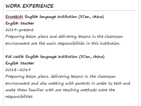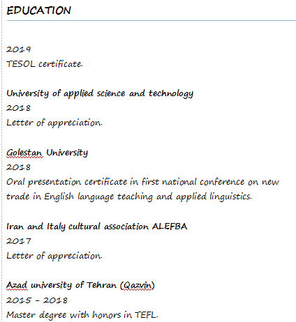 2019年 TESOL證書。 應用科技大學 2018年 古列斯坦大學 2018年 在第一屆全國英語語言教學和應用語言新交易會議上口頭頒發(fā)的證書。 伊朗和意大利文化協(xié)會ALEFBA 2017年 德黑蘭阿扎德大學(Qazvin) 2015年-2018年 擁有TEFL榮譽碩士學位。 Mehre-e_Aval外語系 2015年-2018年 TEC參加30小時培訓課程的證書 工作經驗 Ecusekids英語語言學院(中國西安) 英語老師 2019年至今 在教室環(huán)境中準備課程計劃和授課是該機構的主要職責。 兒童英語語言學校(中國西安) 英語老師 2018–2019 準備課程計劃,在教室環(huán)境中上課,并與父母見面以進行技術學習,并使他們熟悉我們的教學方法是我們的責任 |