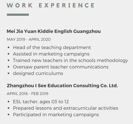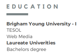 教育背景: 楊百翰大學(xué)-ITESOLWeb媒體獲獎(jiǎng)大學(xué)學(xué)士學(xué)位 TESOL 工作經(jīng)驗(yàn) 2019年5月-2020年4月 漳州愛視教育咨詢有限公司 ESL tacher,03至12歲 準(zhǔn)備的課程和課外活動(dòng) 參加營(yíng)銷活動(dòng) 2018年4月-2019年2月 教學(xué)部主任 協(xié)助行銷活動(dòng) 在學(xué)校方法論方面培訓(xùn)新老師 監(jiān)督家長(zhǎng)老師的溝通 設(shè)計(jì)課程 |