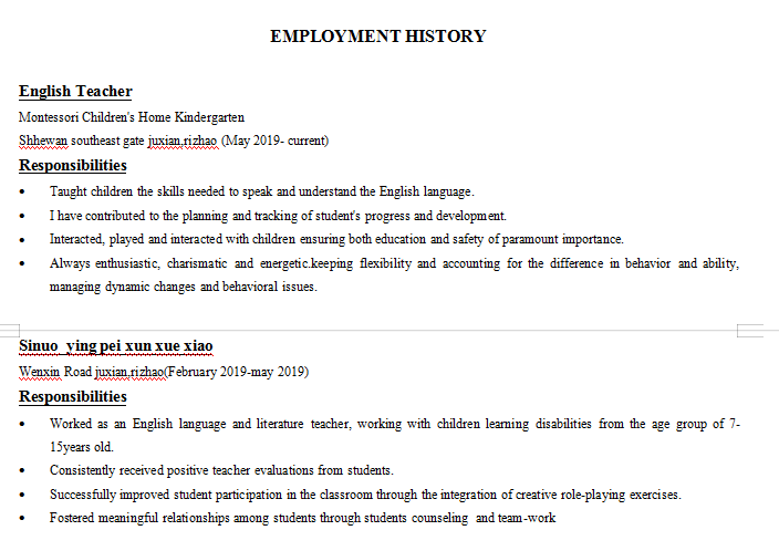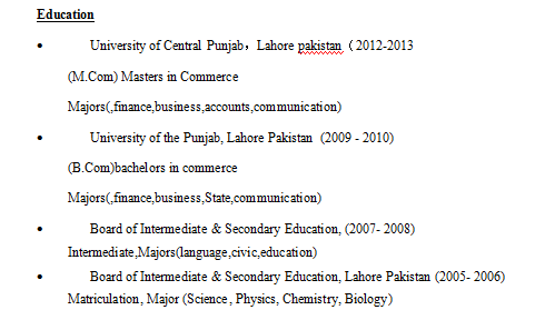 教育 ?巴基斯坦拉合爾中央旁遮普大學(xué)(2012-2013) 商學(xué)碩士 專業(yè)(財(cái)務(wù),業(yè)務(wù),賬戶,交流) 巴基斯坦拉合爾旁遮普大學(xué)(2009-2010) 商業(yè)學(xué)士 專業(yè)(金融,商務(wù),國(guó)家,傳播) ?中級(jí)和中等教育委員會(huì),(2007-2008年) 中級(jí),專業(yè)(語(yǔ)言,公民,教育) ?巴基斯坦拉合爾中級(jí)和中等教育委員會(huì)(2005-2006年) 大學(xué)預(yù)科(科學(xué),物理,化學(xué),生物學(xué)) 工作經(jīng)歷 英語(yǔ)老師 蒙特梭利兒童家庭幼兒園 臨hao市wan灣東南大門(mén)(2019年5月至今) 職責(zé)范圍 ?教給孩子講和理解英語(yǔ)所需的技能。 ?我為計(jì)劃和跟蹤學(xué)生的進(jìn)步與發(fā)展做出了貢獻(xiàn)。 ?與兒童互動(dòng),玩耍和互動(dòng),確保教育和安全至關(guān)重要。 ?始終保持熱情,魅力和活力。保持靈活性并解決行為和能力上的差異,管理動(dòng)態(tài)變化和行為問(wèn)題。 日照市文新路(2019年2月至2019年5月) 職責(zé)范圍 ?曾擔(dān)任英語(yǔ)和文學(xué)老師,與7至15歲年齡段的學(xué)習(xí)障礙兒童合作。 ?不斷獲得學(xué)生對(duì)老師的積極評(píng)價(jià)。 ?通過(guò)整合創(chuàng)造性的角色扮演練習(xí),成功提高了學(xué)生在課堂上的參與度。 ?通過(guò)學(xué)生輔導(dǎo)和團(tuán)隊(duì)合作,增進(jìn)了學(xué)生之間有意義的關(guān)系 |