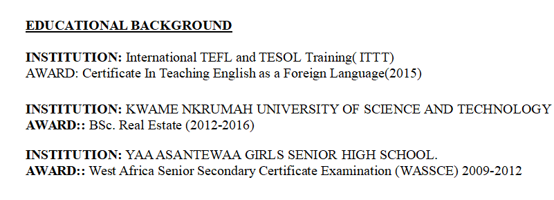 學(xué)歷 機(jī)構(gòu):國(guó)際TEFL和TESOL培訓(xùn)(ITTT) 獎(jiǎng)項(xiàng):英語(yǔ)作為外語(yǔ)教學(xué)證書(2015年) 機(jī)構(gòu):KWAME NKRUMAH科技大學(xué) 獎(jiǎng)項(xiàng)::理學(xué)士。房地產(chǎn)(2012-2016) 花旗縣第一中學(xué)-湖南省張家界市慈利縣 (2018年8月–至今) 新教育高級(jí)中學(xué)-新教育(2013年9月兼職)  |