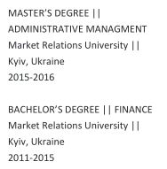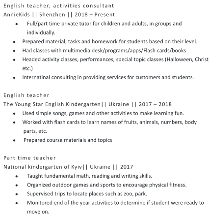 專業(yè)經(jīng)驗(yàn) 英語老師,活動(dòng)顧問 AnnieKids || 深圳|| 2018年–至今 英語老師 青年之星英語幼兒園|| 烏克蘭|| 2017年– 2018年 碩士學(xué)位|| 行政管理 市場關(guān)系大學(xué)|| 烏克蘭基輔 2015-2016  |