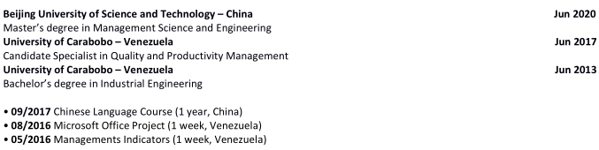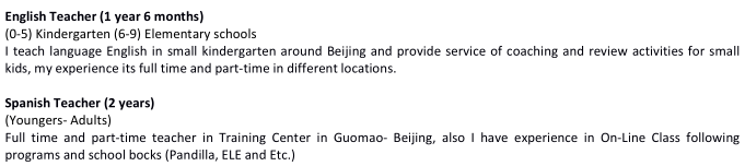 專業(yè)經(jīng)驗 英語老師(1年6個月) (0-5)幼兒園(6-9)小學 我在北京附近的一家小型幼兒園教語言英語,并為小型幼兒園提供輔導和復習活動 ,我在不同地點的全職和兼職經(jīng)歷。 教育 北京科技大學–中國2020年6月 管理科學與工程碩士學位  |