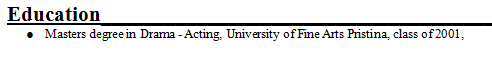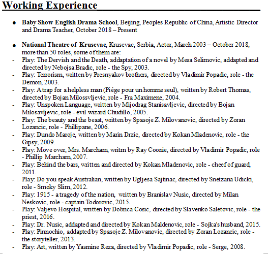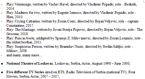 教育背景: 普里什蒂納美術(shù)大學(xué) 戲劇表演碩士學(xué)位 -演員,2001年 ●2018年10月–至今,中國北京aby Show英語戲劇學(xué)校,藝術(shù)指導(dǎo)和戲劇老師 ●2003年3月– 2018年10月,塞爾維亞克魯塞瓦茨國家劇院,演員,超過50個角色,其中一些是: 萊斯科瓦茨國家劇院,塞爾維亞萊斯科瓦茨,演員,1998年8月– 2000年6月 RTS播出了五部不同的電視連續(xù)劇,塞爾維亞廣播電視臺(國家電視臺),四部電影,塞爾維亞,演員,2007年– 2017年  |
