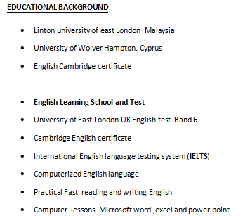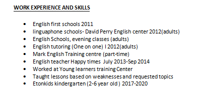 教育背景: 馬來西亞東倫敦林頓大學(xué) 塞浦路斯伍爾弗漢普頓大學(xué) 英語劍橋證書 教學(xué)經(jīng)歷: 英語第一所學(xué)校2011 ?語言學(xué)校-大衛(wèi)·佩里英語中心2012(成人) ?英語學(xué)校,夜校(成人) 英語補(bǔ)習(xí)(一對一)I 2012(成人) ?馬克英語培訓(xùn)中心(兼職) 英語老師歡樂時光2013年7月至2014年9月 ?在青少年培訓(xùn)中心工作 根據(jù)弱點(diǎn)和要求的主題講授的課程 ?伊頓基幼兒園(2-6歲)2017-2020  |