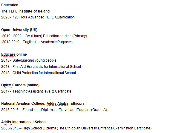 教育經(jīng)歷: TEFL 英國開放大學 工作經(jīng)歷: 埃塞俄比亞孤兒院志愿者英語老師2014 – 2014 新開羅大英圖書館和早教助理2017-2017 國際學校 小型托兒所,埃及早教助教2017- 2019 教師2019  |
