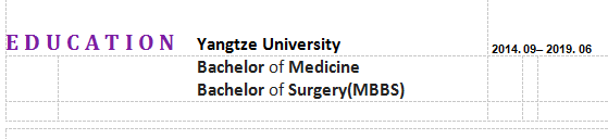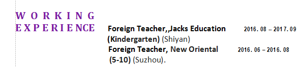 教育背景: 揚子江大學 本科 2014-2019 教學經(jīng)驗: 2016/8-2017/9:實驗幼兒園 英語老師 2016/6-2016/8:英語老師 蘇州  |