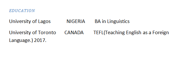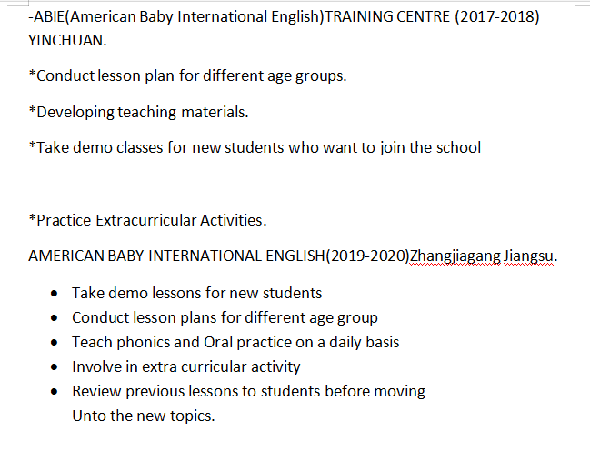 國際英語培訓(xùn)中心(2017-2018)銀川。 *制定針對不同年齡段的課程計劃。 *編寫教材。 *為想加入學(xué)校的新生舉辦模擬班 *實(shí)踐課外活動。 美國國際英語(2019-2020)江蘇張家港。 ?為新生開設(shè)模擬課程 ?針對不同年齡段的人制定教學(xué)計劃 每天教授語音和口語練習(xí) 參與課外活動 ?移動前復(fù)習(xí)給學(xué)生的以前的課程 進(jìn)入新主題。 教育 拉各斯大學(xué)尼日利亞語言學(xué)學(xué)士 多倫多大學(xué)加拿大TEFL(英語作為外語教學(xué)).2017。  |