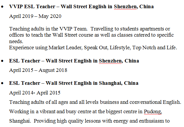 VVIP ESL老師–中國深圳華爾街英語 2019年4月– 2020年5月 ESL教師–中國深圳的華爾街英語 2015年4月– 2018年8月 ESL教師–中國上海的華爾街英語 2014年4月至2015年4月 大學:電影研究學士學位 |