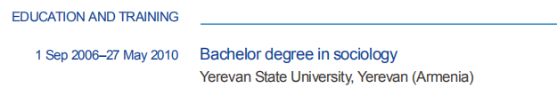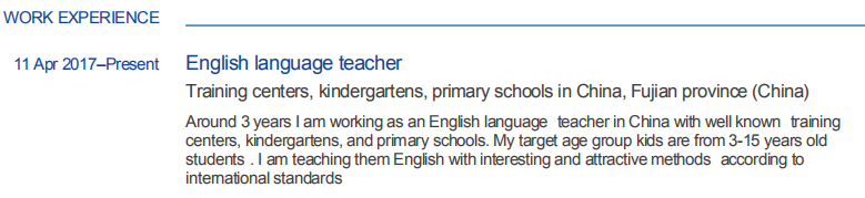 教學(xué)經(jīng)驗(yàn): 在福建省有三年教學(xué)經(jīng)驗(yàn) 培訓(xùn)學(xué)校和幼兒園 2017-目前 英語教師兼外語系主任 甲骨文研發(fā)公司 2010/6-2012/12 教育背景: 社會學(xué)學(xué)士學(xué)位 埃里溫國立大學(xué),埃里溫(亞美尼亞) 2006/9-2010/5  |