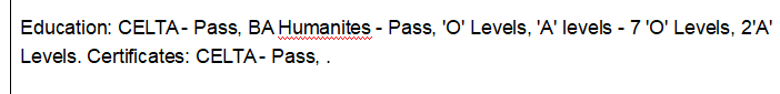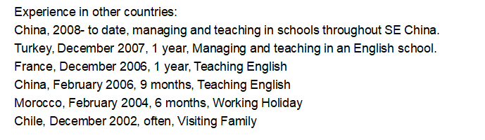 中國,2008年至今,在整個中國東南地區(qū)的學校中進行管理和教學。 土耳其,2007年12月,為期1年,在一家英語學校進行管理和教學。 法國,2006年12月,一年,教授英語 中國,2006年2月,9個月,英語教學 摩洛哥,2004年2月,6個月,工作假期 教育程度:CELTA -通過本科人文科學-通過。 |