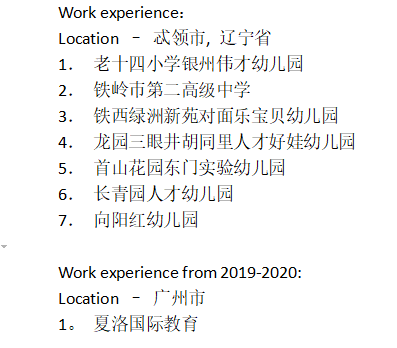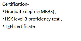 研究生學(xué)位(MBBS), ?HSK 3級能力測驗, ?TEFl證書 1. 老十四小學(xué)銀州偉才幼兒園 2. 鐵嶺巿第二高級中學(xué) 3. 鐵西綠洲新苑對面樂寶貝幼兒園 4. 龍園三眼井胡同里人才好娃幼兒園 5. 首山花園東門實驗幼兒園 6. 長青園人才幼兒園 7. 向陽紅幼兒園