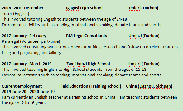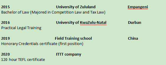 祖魯蘭大學(xué)恩潘蓋尼大學(xué)法學(xué)學(xué)士(競爭法和稅法專業(yè)),有TEFL證書,在南非德班有高中教學(xué)經(jīng)驗(yàn),目前在中國培訓(xùn)班工作。 |