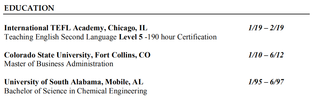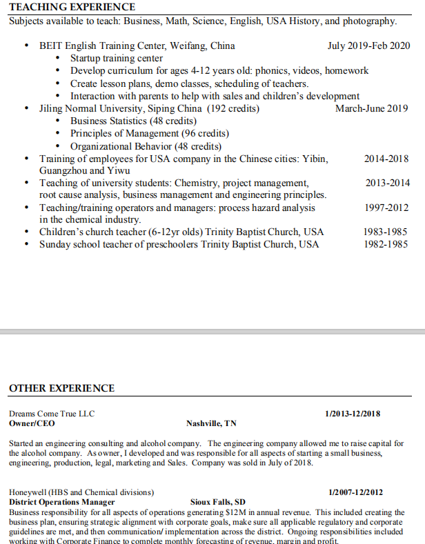 教育 伊利諾伊州芝加哥,國際TEFL學院1/19 – 2/19 英語第二語言教學水平5 -190小時認證 科羅拉多州立大學,柯林斯堡,科羅拉多州1/10 – 6/12 工商管理碩士 南阿拉巴馬大學莫比爾分校1/95 – 6/97 化學工程學士學位 教學經(jīng)驗 可供教授的課程:商業(yè),數(shù)學,科學,英語,美國歷史和攝影。 ?2019年7月至2020年2月,中國濰坊BEIT英語培訓中心 廣州和義烏 ?大學生教學:化學,項目管理 |