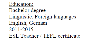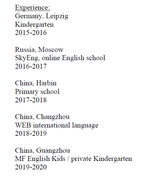 德國萊比錫 幼兒園 2015 - 2016 俄羅斯,莫斯科 SkyEng,在線英語學(xué)校 2016 - 2017 中國,哈爾濱 小學(xué) 2017 - 2018 |
