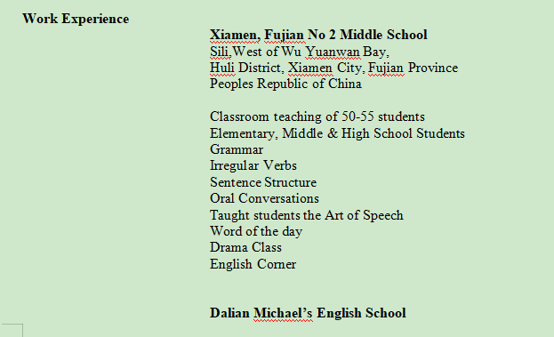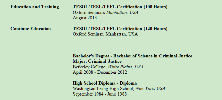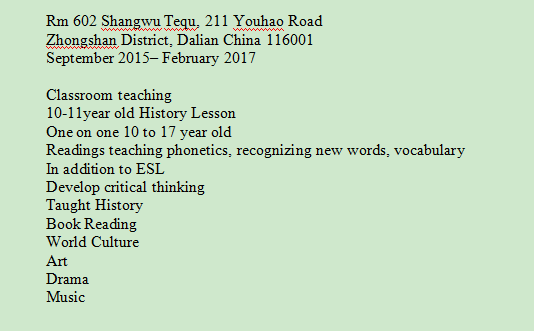美國伯克利學(xué)院司法專業(yè)學(xué)士學(xué)位,有TEFL, TESOL證書,在美國和中國大連及廈門有中學(xué)經(jīng)驗(yàn),教過歷史學(xué)科 |