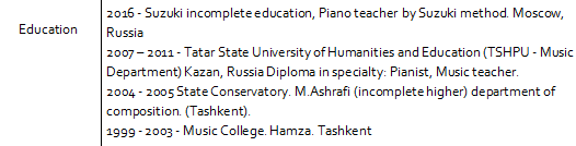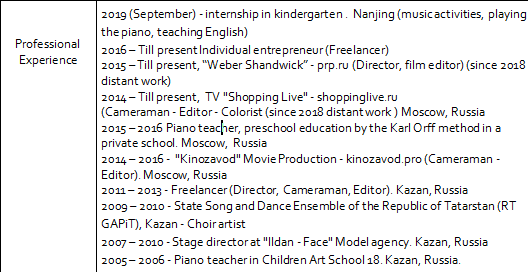 教育背景: 2016年-鋼琴老師。 莫斯科,俄國 2007年– 2011年-塔塔爾國立人文與教育大學(xué)(TSHPU-音樂系)俄羅斯喀山專業(yè)文憑:鋼琴家,音樂老師。 2004年-2005年,國家音樂學(xué)院。 1999年-2003年-音樂學(xué)院。 教學(xué)經(jīng)驗: 2019年(9月)-在幼兒園實習(xí)。 南京(音樂活動,彈鋼琴,教英語) 2016年–至今個人企業(yè)家(自由職業(yè)者) 2015年–至今,“韋伯·桑德威克(Weber Shandwick)”-prp.ru(導(dǎo)演,電影剪輯) 2014年–至今,電視“現(xiàn)場購物”-shoppinglive.ru (攝影師-編輯-調(diào)色師(自2018年以來)莫斯科,俄羅斯 2015 – 2016鋼琴老師,在一所私立學(xué)校通過卡爾·奧爾夫方法進行學(xué)前教育。 俄羅斯莫斯科 2014年– 2016年-電影作品《奇諾扎沃德》-kinozavod.pro(攝影師-編輯)。 俄羅斯莫斯科 2011年– 2013年-自由職業(yè)者(導(dǎo)演,攝影師,編輯)。 俄羅斯喀山 2009年– 2010年-喀山共和國tar斯坦共和國國家歌舞團(RT GAPiT)-合唱團藝術(shù)家 2007年– 2010年-在“ Ildan-Face”模特經(jīng)紀公司擔任舞臺導(dǎo)演。 2005年– 2006年-俄羅斯喀山兒童藝術(shù)學(xué)校的鋼琴老師。 |